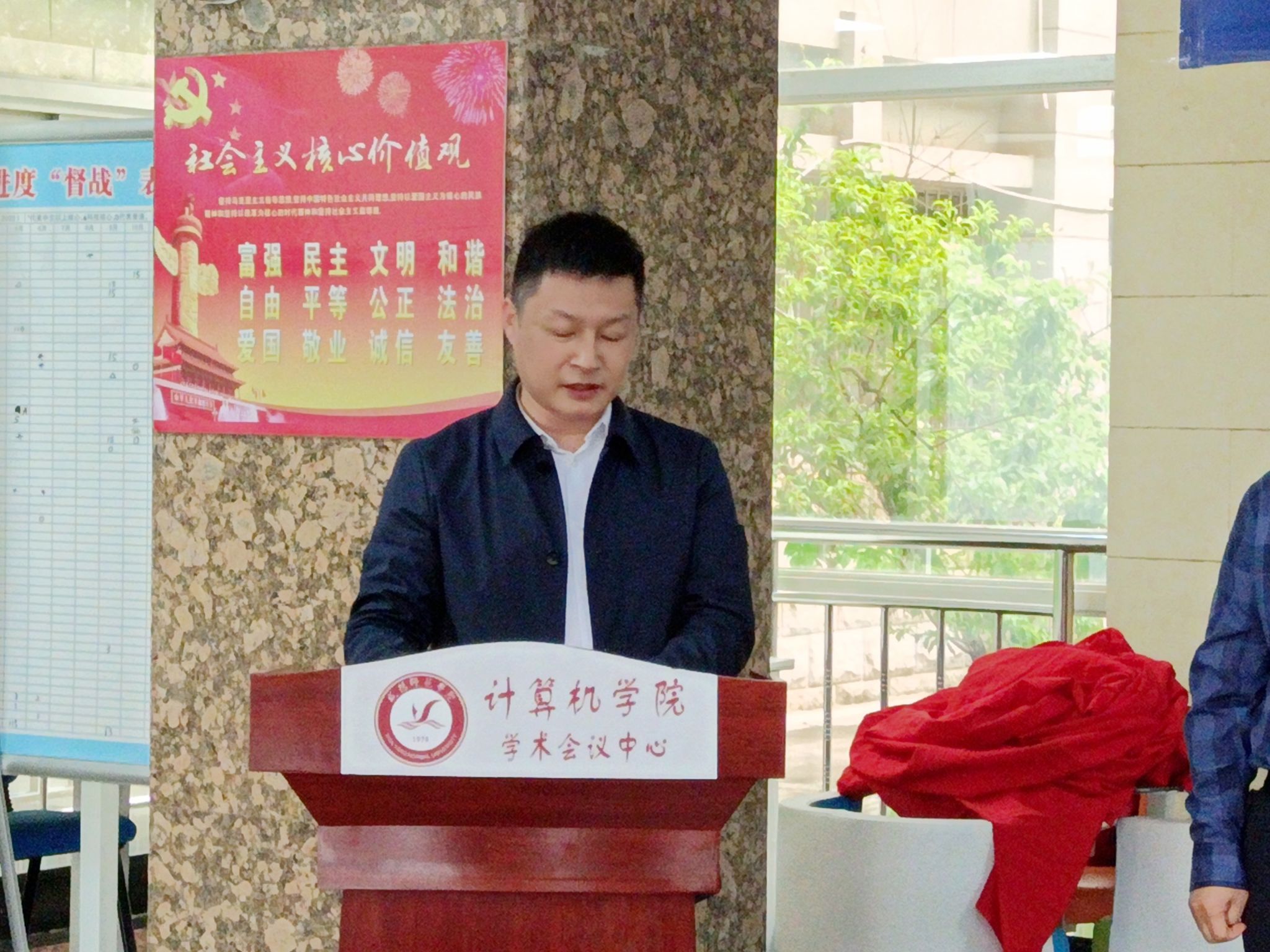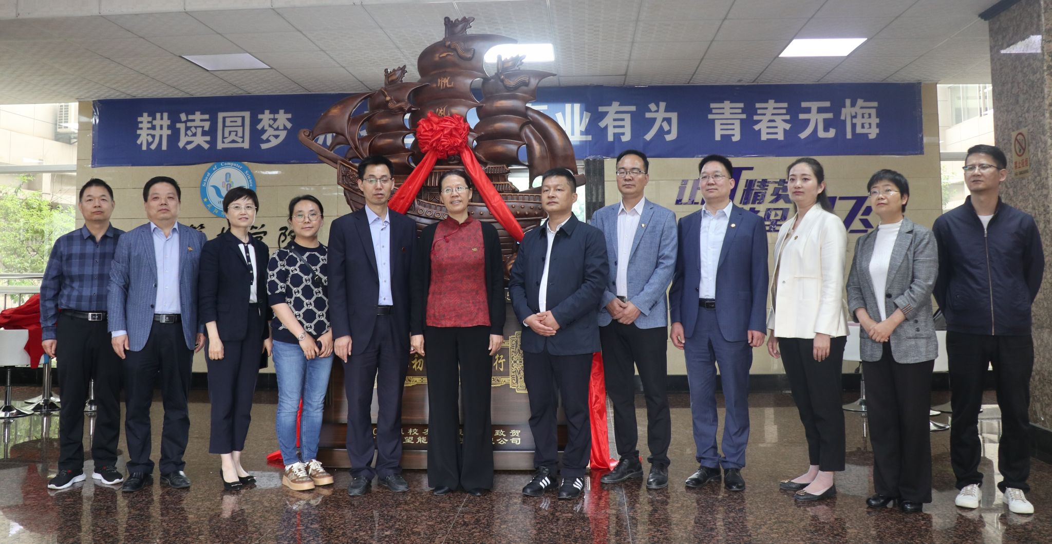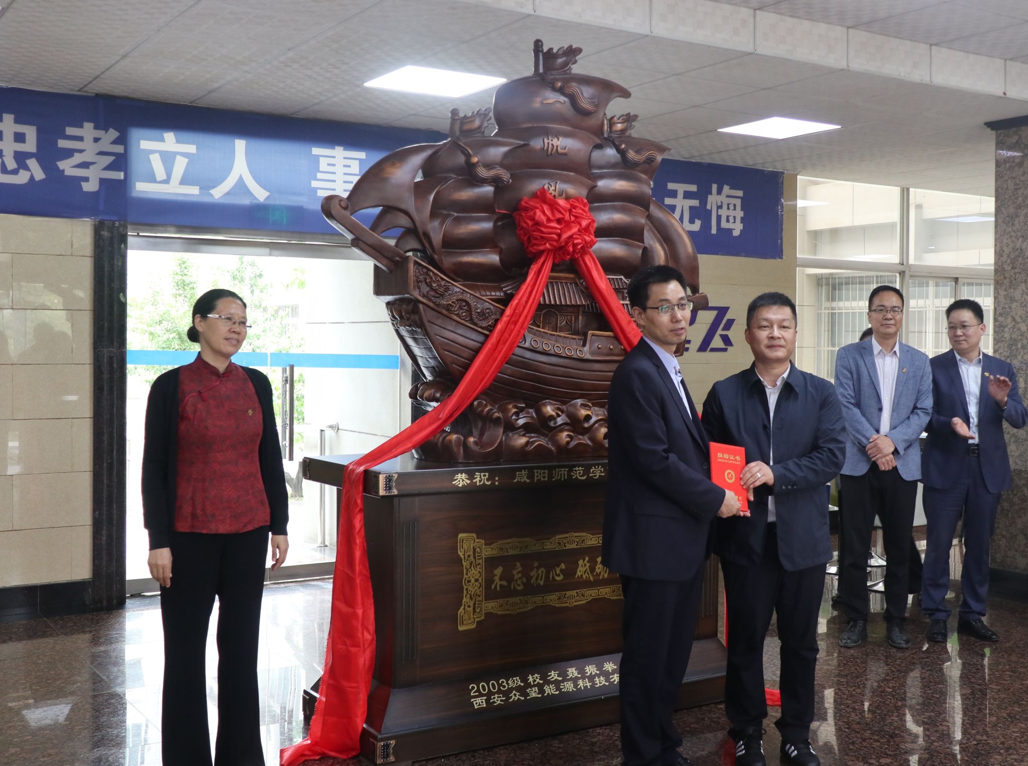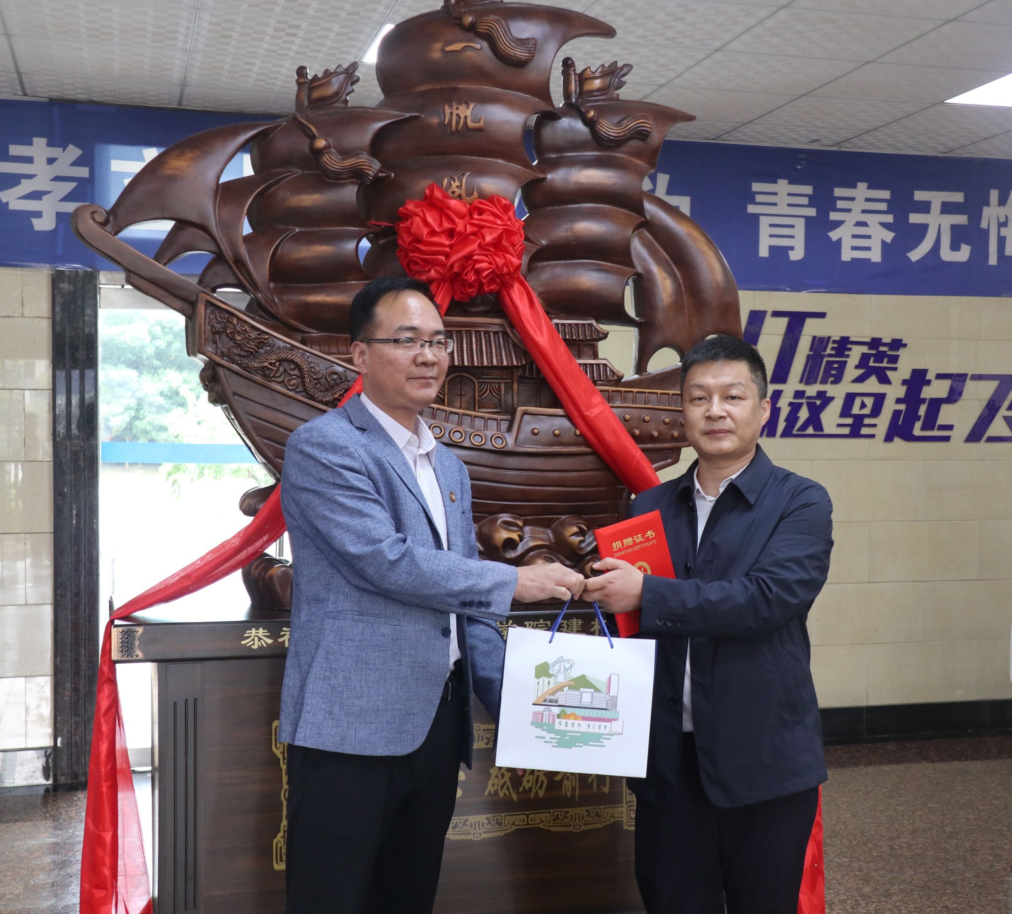 活动中,周群英和优秀员工聂振举共同为一帆风顺摆件揭幕。人才招聘处处长张高科、国有资产管理处副处长田立强向优秀员工聂振举颁发捐赠证书赠送礼品。