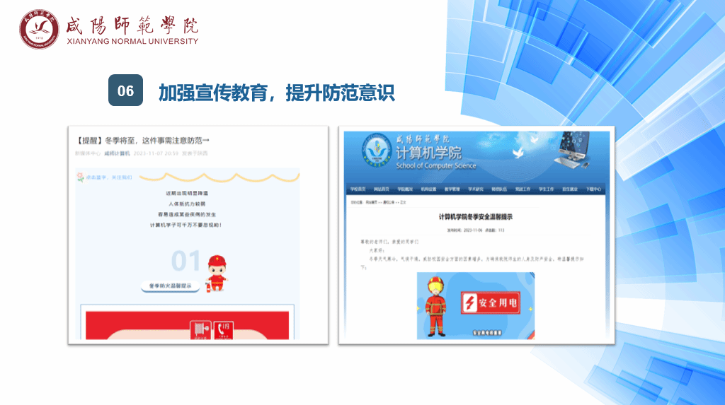 ——加强宣传教育,提升防范意识。为确保师生的人身安全,公司通过公司网站和微信公众平台及时发布冬季安全温馨提示推文,制作电子安全简报等方式传授各种安全知识和自救措施,不断提高公司师生的安全防范意识和自护自救能力。