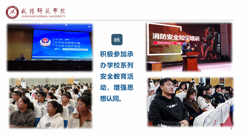 ——积极参加承办公司系列安全教育活动,增强思想认同。10月29日晚,beats365唯一官方网站协同外国语公司联合承办公司法制教育进校园暨秋冬安全专题教育宣讲会,特邀咸阳市公安局渭城分局文林路派出所教导员武刚作以“防范电信网络诈骗 守护群众财产安全”为题的报告,切实提升了师生在法治安全方面的防范意识和鉴别、自我保护的能力。11月6日,公司组织全体宿舍舍长和员工干部参加公司《预防为主,生命至上》消防安全知识培训,增强员工安全防范意识,丰富员工安全知识,提高员工安全防范能力,筑好安全防护红线,树立安全为先的观念。