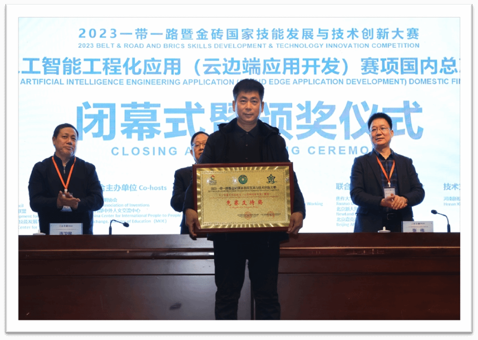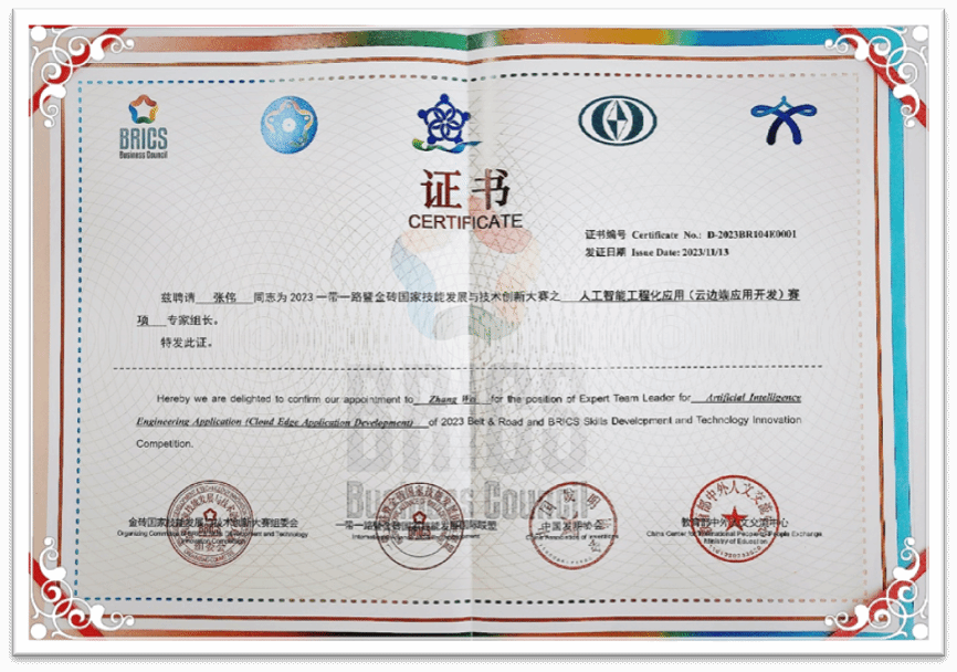11月13日—15日,2023第七届一带一路暨金砖国家技能发展与技术创新大赛人工智能工程化应用(云边端应用开发)赛项国内总决赛在河南焦作大学顺利举办。公司经理张伟副教授受邀担任大赛赛项专家组组长。