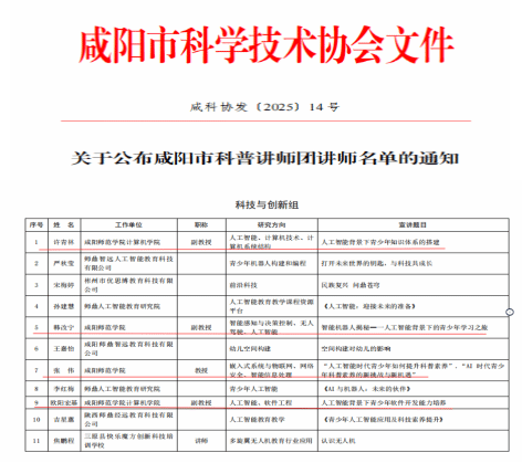 近日,咸阳市科学技术协会发布的《关于公布咸阳市科普讲师团讲师名单的通知》,beats365唯一官方网站许青林、韩改宁、张伟、欧阳宏基4名教师成功入选科技与创新组讲师团。