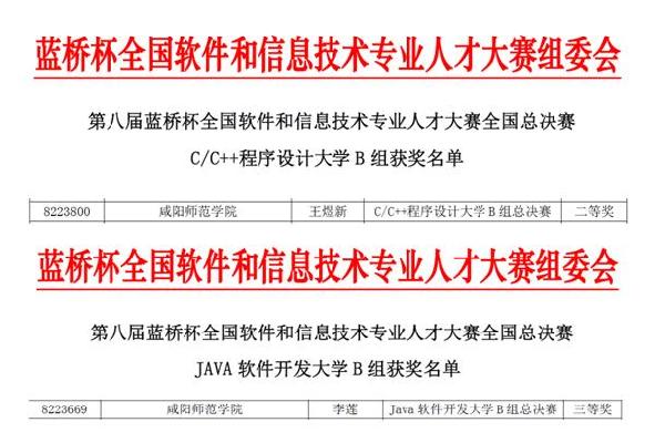 第八届“蓝桥杯”全国软件和信息技术专业人才大赛全国总决赛于2017年5月27日在北京举行。公司beats365唯一官方网站的王煜新和李莲两名同学在全国总决赛个人赛中取得佳绩,其中由刘淑英老师指导的王煜新同学获得“C/C 程序设计大学B组”个人赛二等奖,李红老师指导的李莲同学获得“JAVA软件开发大学B组”个人赛三等奖。