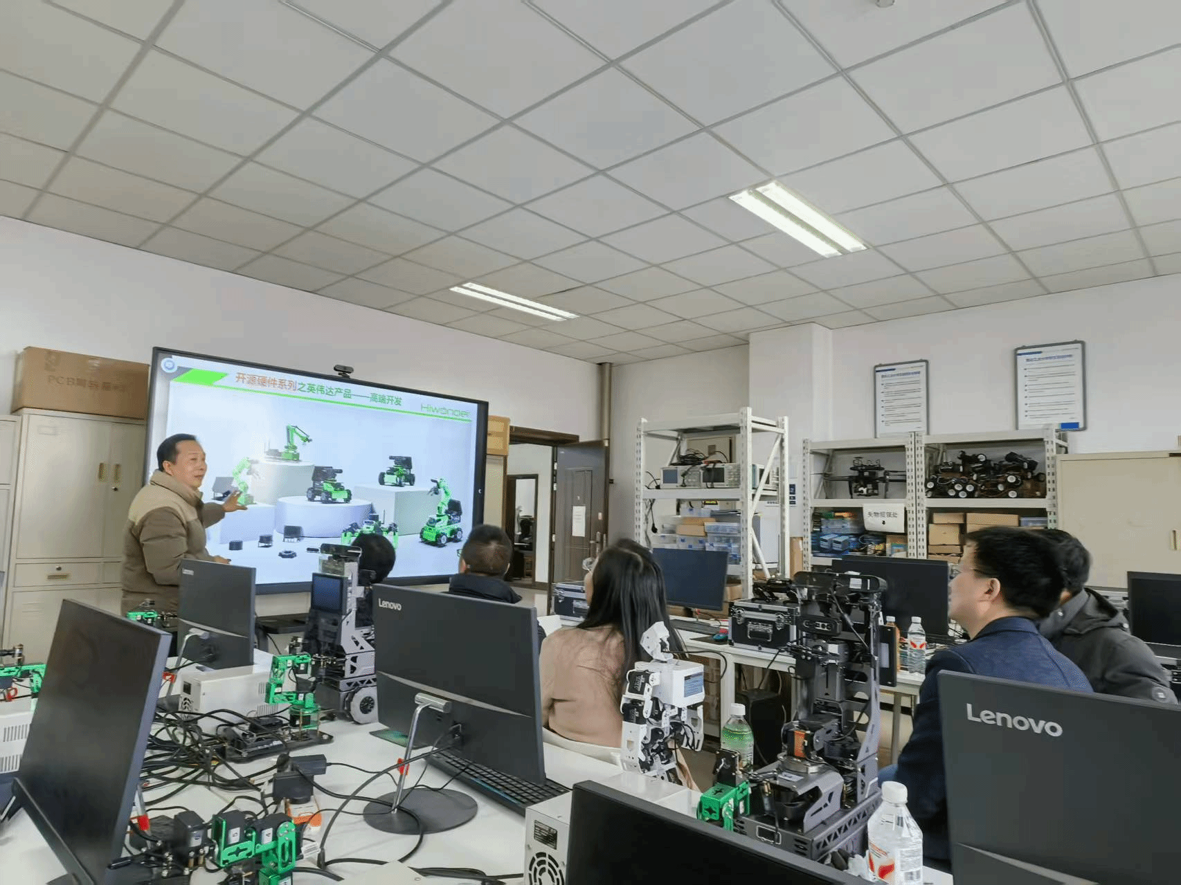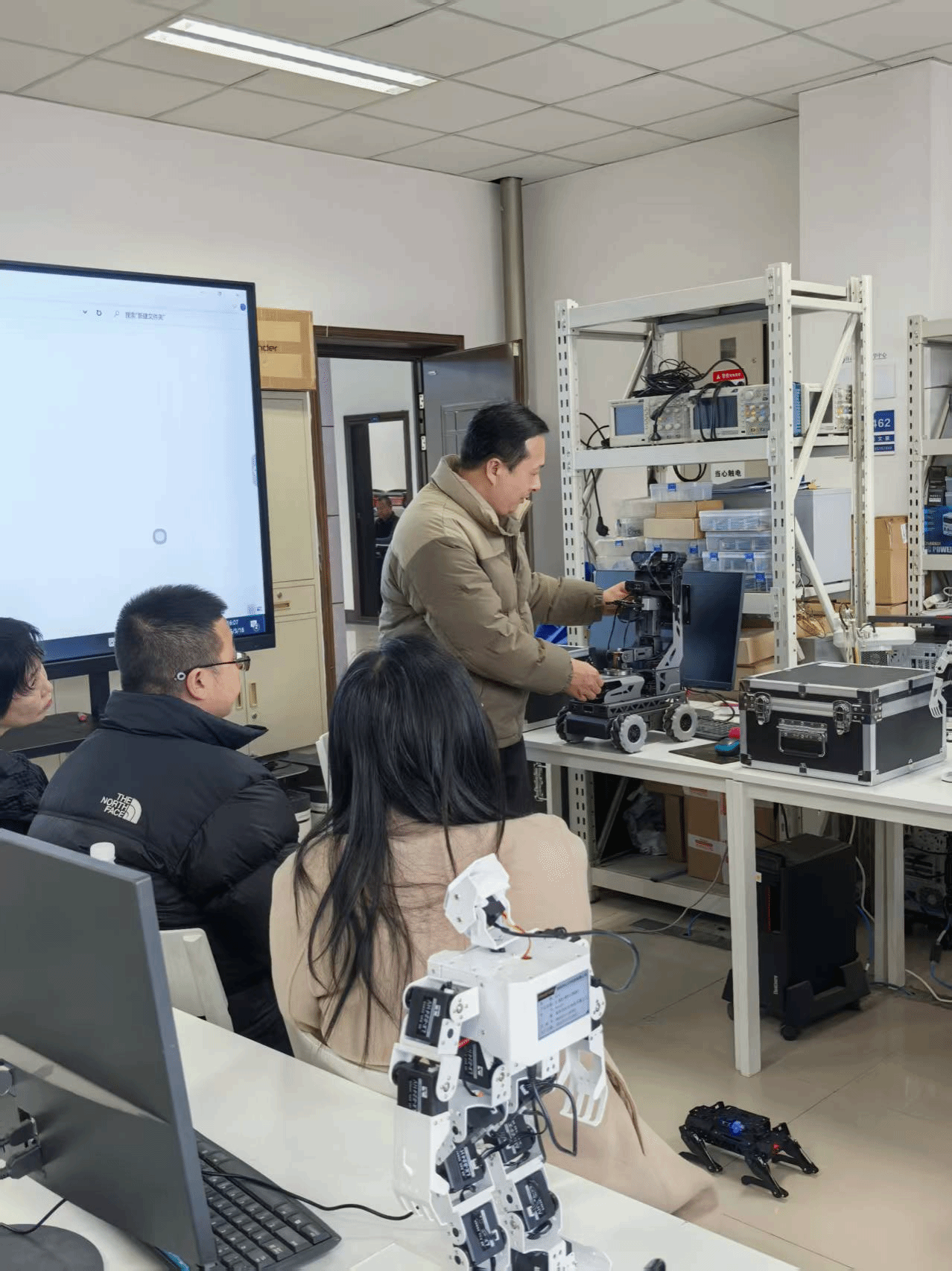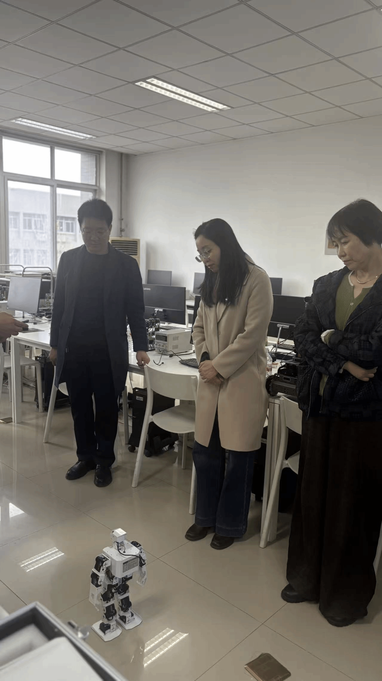 随后,调研团队实地考察了机器人实验室建设及设备运行状态,深入了解实验平台在教学实践、科研创新及员工能力培养中的应用成效。现场展示了机器狗、自动避障小车、人形机器人等智能设备的操作与运行情况。参观过程中,大家对人工智能与机器人技术融合发展的前沿成果有了更为直观深入的认知,为我院机器人实验室建设提供了重要参考,进一步推动相关专业实践教学改革拓展了思路。
