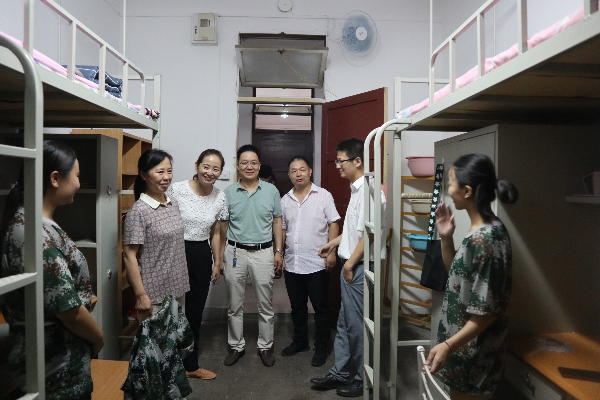9月8日晚,公司党委书记沈会玲、副经理张伟、党委副书记李延、副经理张小波带领全体辅导员、各班班主任助理及团学联主要员工干部走访了2019级新生宿舍,对2019级新生进行了慰问。